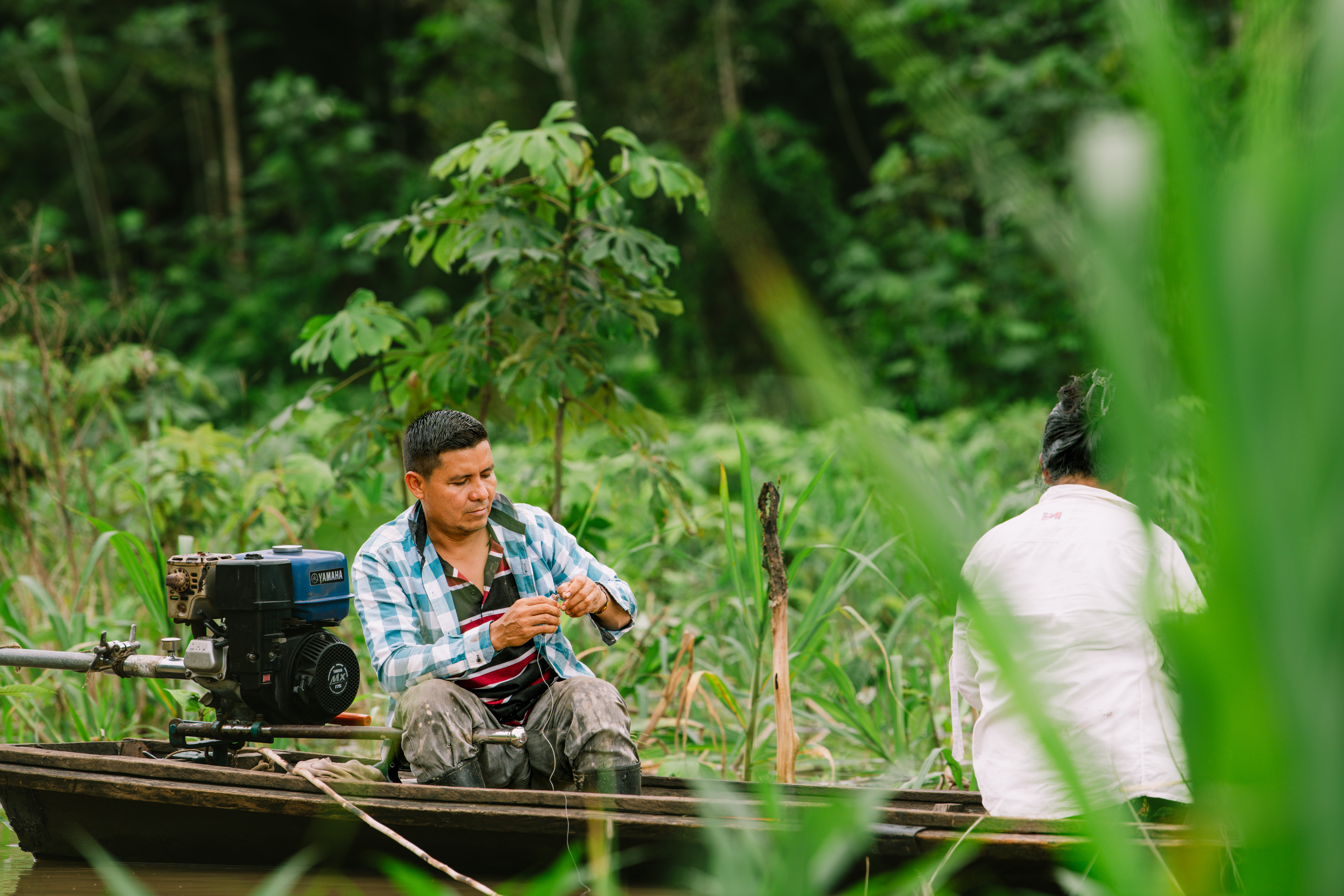Nous partons après le petit-déjeuner pour notre première excursion de 4h dans une petite lancha qui pourra se faufiler plus facilement sur cet affluent très étroit de l’Amazone, ce qui en fait son charme. Après une bonne heure et demie de lancha, nous arrivons au début de notre trek dans la jungle. La végétation est incroyable, luxuriante et si verte. Notre guide avance, machette en main, pour nous créer un passage lorsque cela est nécessaire.