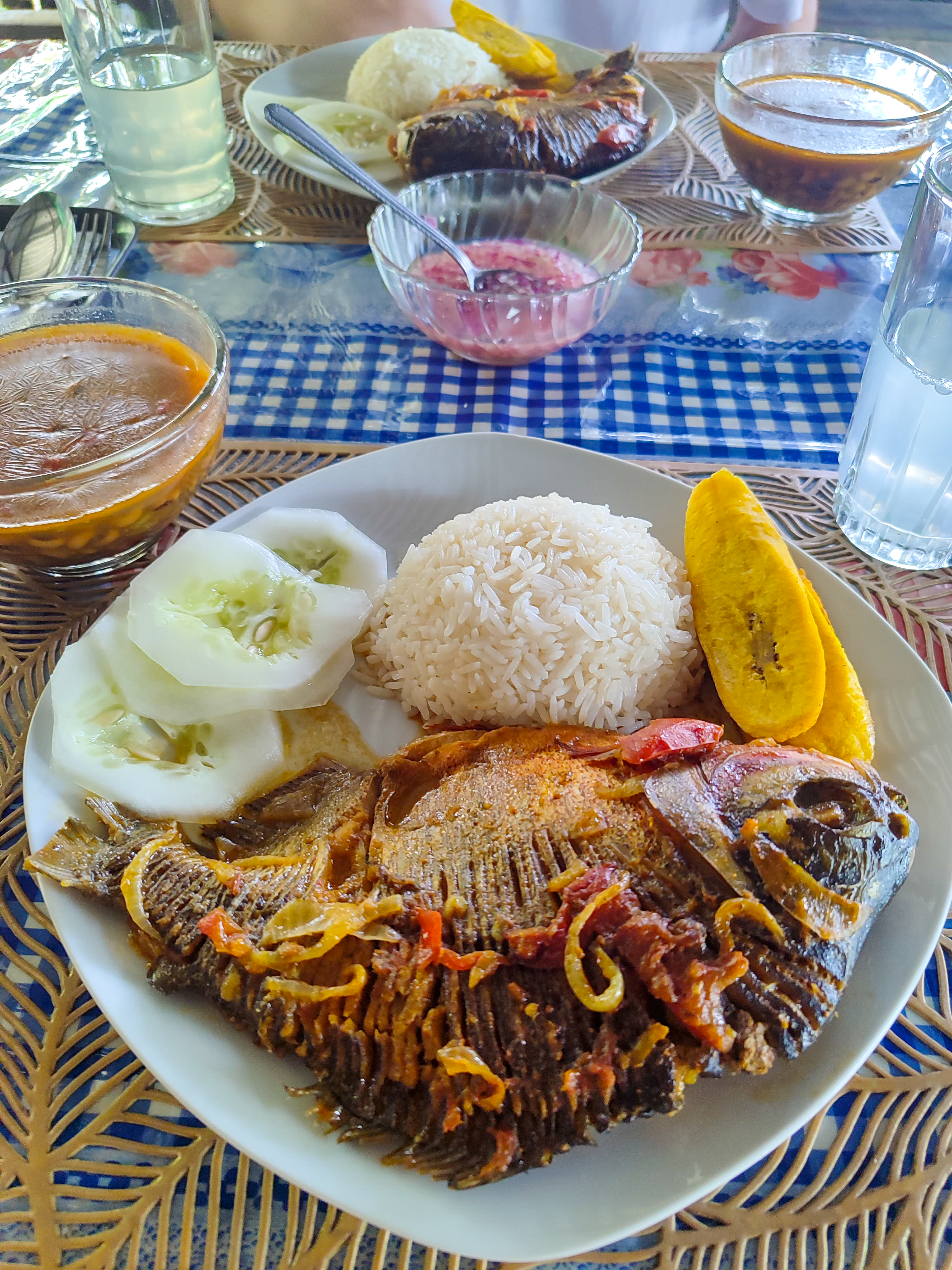 Bon, après les petites bêtes voici un sujet plus agréable. Bien que les spécialités culinaires soient limitées, les repas étaient délicieux et préparés avec des ingrédients issus principalement de la pêche et des récoltes locales. Nous avons savouré de succulents poissons grillés, dont du piranha, accompagnés de bananes plantains, de riz, d’une sauce épicée aux oignons et de légumes frais. Leur alimentation, basée sur des produits naturels et locaux, est particulièrement saine comparée à d’autres régions de la Colombie.